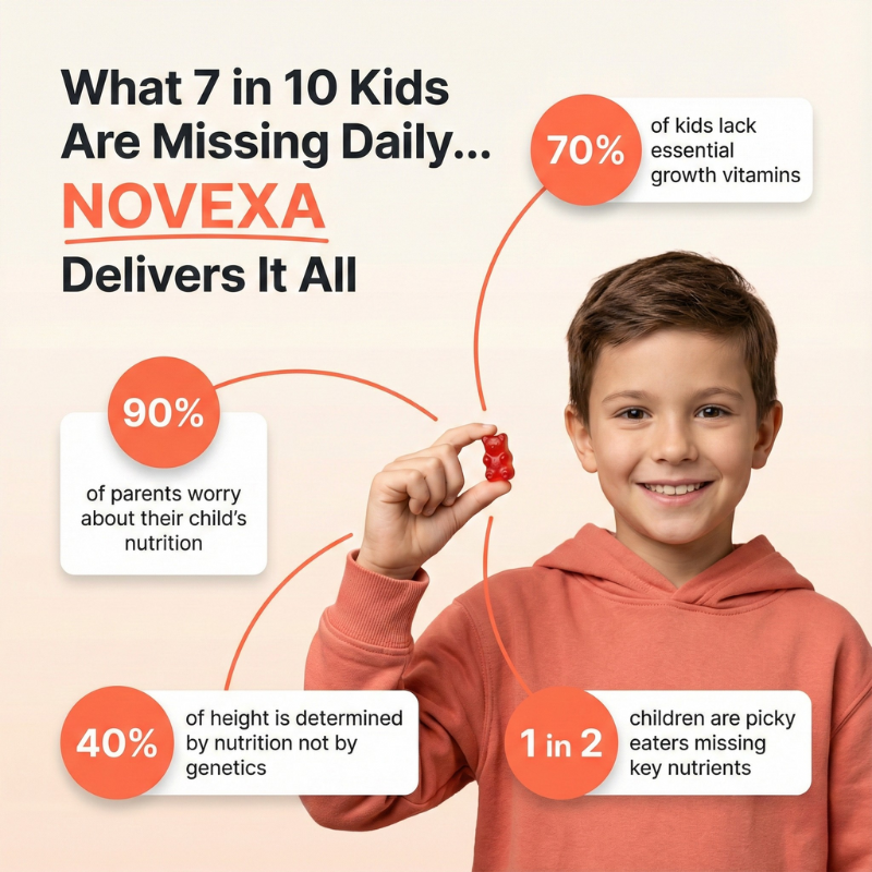 Novexa gives him the complete toolkit: Calcium + D3 + K2 (the trio most kids are missing), growth-supporting amino acids, and sleep optimizers that maximize growth hormone release.