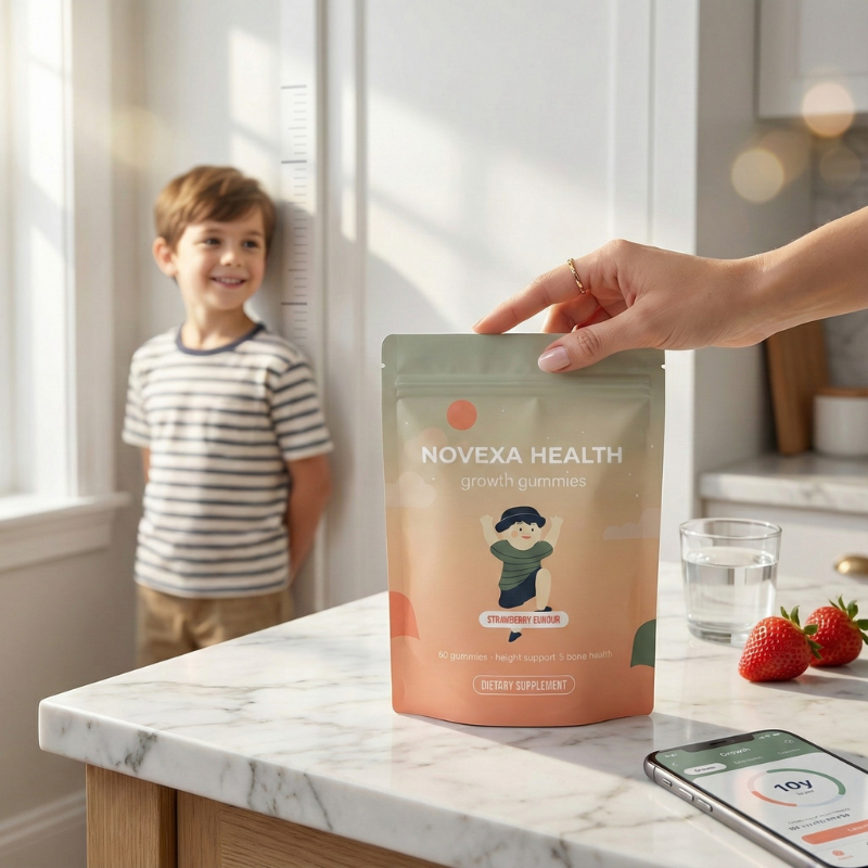 Novexa solves this in 30 seconds a day. Two gummies = the calcium, D3, K2, and growth nutrients they're NOT getting from food.
